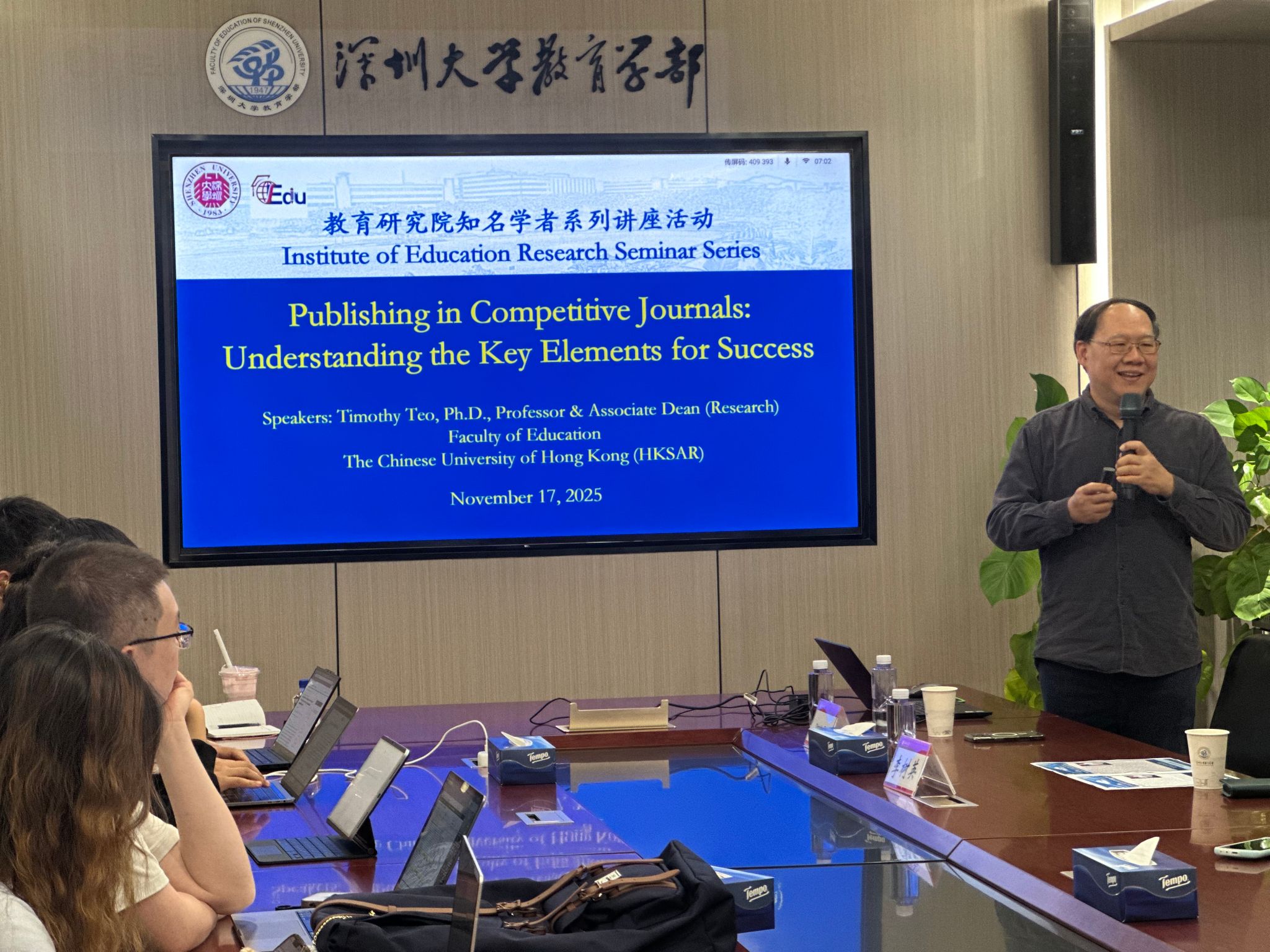 2025年11月17日下午,教育学部知名学者系列讲座活动于汇德楼A412会议室举行,香港中文大学教育学院副院长Timothy Teo教授带来题为《在高水平期刊上发表的核心要素》的专题学术讲座。本次讲座由教育学部教育研究院院长李树英主持,教育学部相关师生参与讲座。