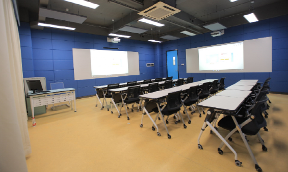 未来教室是具备远程互动教学的新型教室,包含直播软件系统、显示系统、板书系统、扩声系统、控制系统、灯光系统等多功能系统。303课室可以完成分组互动教学。303课室和306课室之间可以通过直播采集终端、远程教学终端、高清摄像头、多通道音频处理器等设备完成联合教学,互动讨论。当教师在其中一间教室进行授课,可将授课现场画面及电脑内容同步传输听课教室;同时教师可通过旁边的其他显示设备看到听课教室内学生的情况;而处于听课教室的学生,可通过投影大屏同步直播观看授课现场画面;在有交流和互动需求的时候,这两个室可身份互换,都能实现讲课或听课功能,实现主播和听众功能的切换。303课室提供远程授课功能,可通过微信实时观摩授课内容。